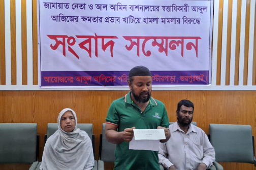 জয়পুরহাটে রাজনৈতিক প্রভাব ও অর্থের দাপট খাটিয়ে একটি পরিবারকে হয়রানি ও মিথ্যা চুরির মামলায় জড়ানোর অভিযোগ উঠেছে জামায়াত নেতা ও আল আমিন বাসনালয়ের স্বত্বাধিকারী আব্দুল আজিজের বিরুদ্ধে। এর প্রতিবাদে এবং সঠিক বিচার চেয়ে সংবাদ সম্মেলন করেছে ভুক্তভোগী পরিবার।