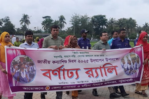‘আমি কন্যাশিশু স্বপ্নগড়ি, সাহসে লড়ি, দেশের কল্যাণে কাজ করি’ প্রতিপাদ্য নিয়ে পটুয়াখালী জেলা প্রশাসন ও মহিলা বিষয়ক অধিদপ্তরের আয়োজনে জাতীয় কন্যাশিশু দিবস-২০২৫ উদযাপন উপলক্ষে র্যালি ও আলোচনা সভা অনুষ্ঠিত হয়েছে।